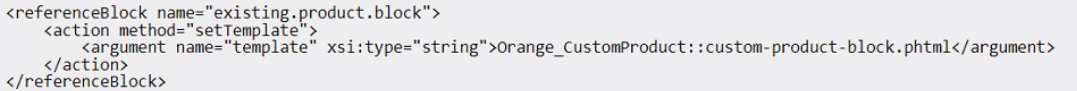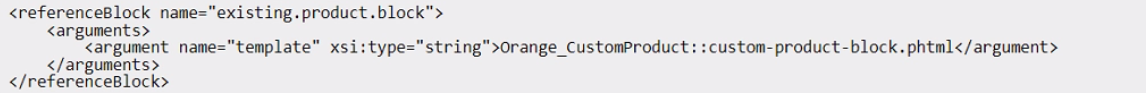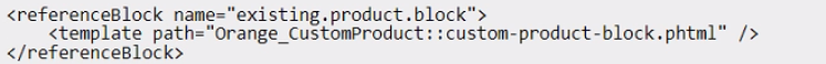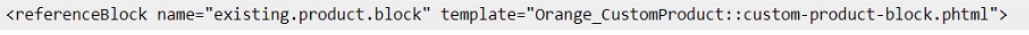 <referenceBlock name=''existing.product.block'' template=''Orange_CustomProduct::custom-product-block.phtml''/>