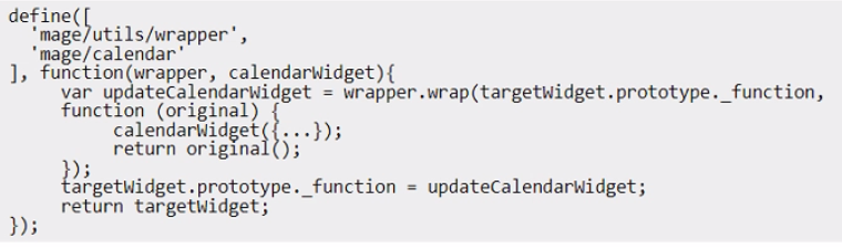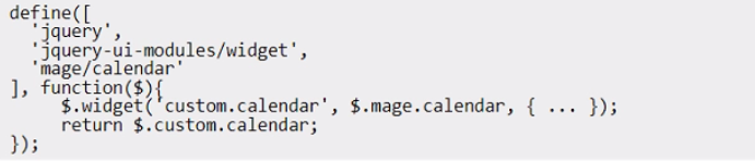 Option A is not correct because it does not use the correct syntax for defining a jQuery widget. It uses a script tag instead of a define function, which is not valid for creating a module. It also uses an incorrect name for the widget, which should use a dot instead of a slash. Option C is not correct because it does not use the correct syntax for extending a widget. It uses an extend function instead of a widget function, which is not valid for creating a new widget. It also does not return anything from the module, which will cause an error. Reference: [jQuery widgets], [Calendar Widget]