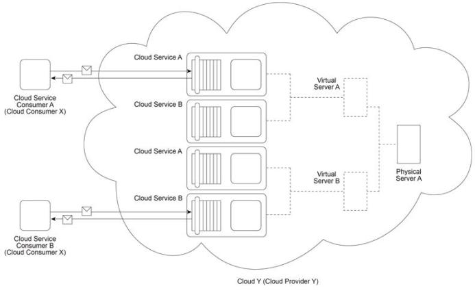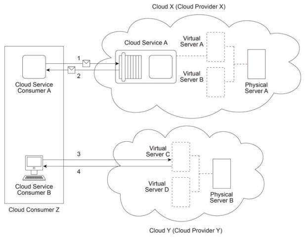 Cloud Provider X has deployed a virtualization environment in Cloud X comprised of Physical Server A hosting Virtual Servers A and B. Cloud Provider X implements Cloud Service A on Virtual Server A and makes it available to Cloud Service Consumer A, which interacts with Cloud Service A by sending and receiving messages (1, 2). Cloud Provider Y has deployed a virtualization environment comprised of Physical Server B hosting Virtual Servers C and D. Virtual Server C is made available to Cloud Service Consumer B, which interacts with Virtual Server C (3,4) in order to prepare for the deployment of a new cloud service that will be used internally by Cloud Provider Y to process data obtained from Cloud Service A .