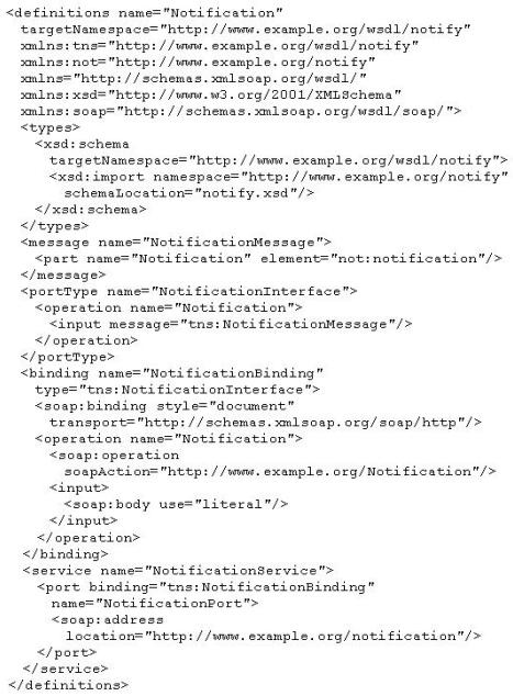 The technical architecture department contacts you to tell you that all existing WSDL definitions need to be modified to add an additional concrete description in order to bind the service to a new version of SOAP. You begin with the WSDL definition for the Notification service, as shown here: