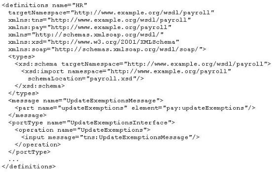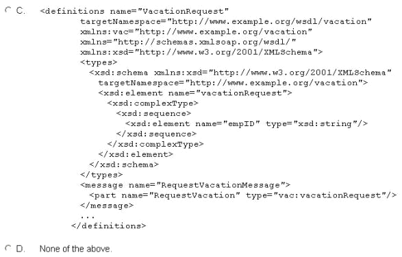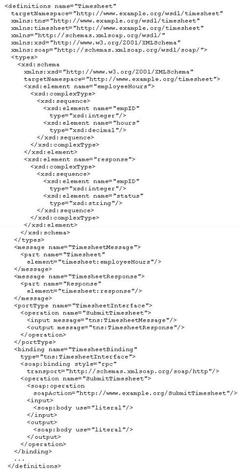 Your developer is asked to build a Timesheet service that is able to receive timesheet submissions for an internal payroll system. Service consumers need to be able to send this service request message based on a root "employeeHours" element within the SOAP message body. The "employeeHourse" element will contain "ernpID" and "hours" child elements. Furthermore, the service needs to return a message based on a "response" element that contains "empID" and "status" child elements. Your developer comes to you with the following WSDL definition: