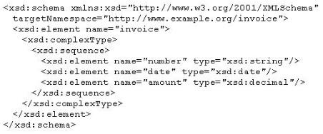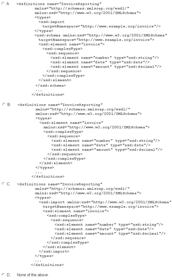 The Invoice Reporting service needs to represent invoice data in a unique format. Therefore, this schema will only be used by the WSDL definition for the Invoice Reporting service. As a result, you decide to embed the schema inside the WSDL definition. Which of the following shows a valid way to accomplish this?