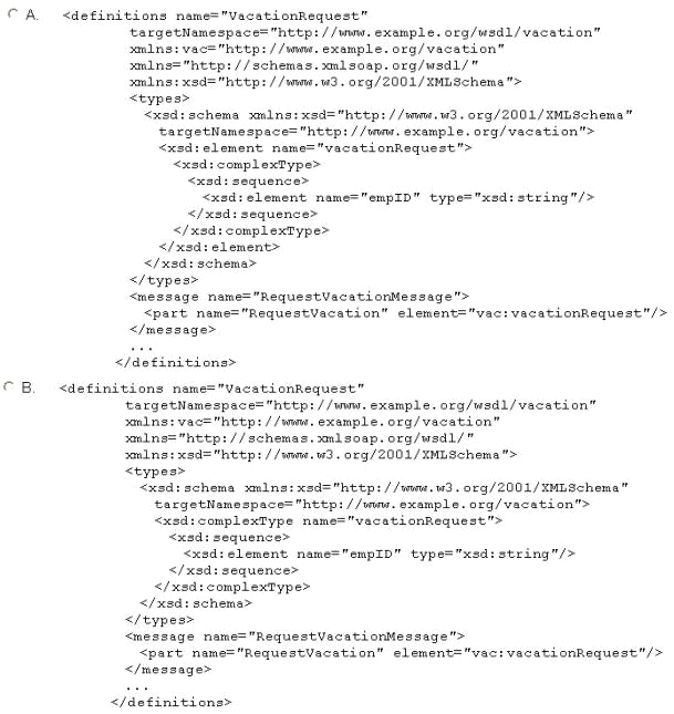 The "vacationRequest" element (which will be placed inside a SOAP "Body" element) contains a child "empID" element that will provide the employee ID used by the Vacation Request service to perform a search. Your task is to define an XML schema for this message and to incorporate the schema into the Vacation Request WSDL definition by embedding the schema content and mapping the XML Schema elements to the appropriate WSDL elements. Which of the following correctly accomplishes this?