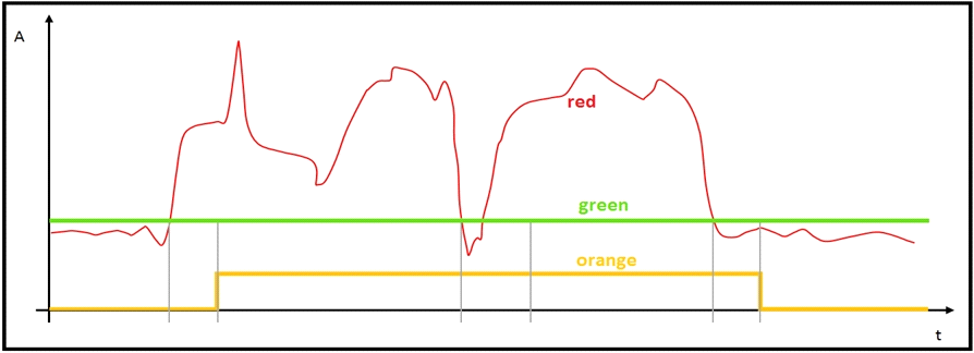 The red line represents the energy consumption of an industrial machine. Which two statements about the graphs are true? (Choose two.)