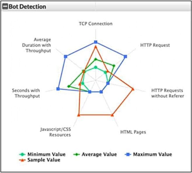 In the SVM plot of potential bot activity, you can see that the sample value (orange) is significantly different from the average value (green) and the maximum value (blue) in most of the metrics. This suggests unusual or abnormal behavior, indicating that the connection might be a bot. Typically, bots exhibit patterns that diverge from normal user activity, such as higher frequencies of certain types of requests, abnormal throughput, or an unusual pattern of HTTP requests (such as requests without referers or excessive TCP connections).