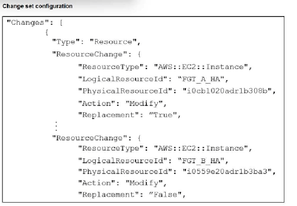 You are managing an active-passive FortiGate HA cluster in AWS that was deployed using CloudFormation. You have created a change set to examine the effects of some proposed changes to the current infrastructure. The exhibit shows some sections of the change set.