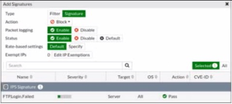 Review the Intrusion Prevention System (IPS) profile signature settings. Which statement is correct in adding the FTP.Login.Failed signature to the IPS sensor profile?