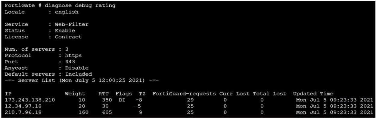 FortiGate Security 7.2 Study Guide (p.287-288): 'Flags: D (IP returned from DNS), I (Contract server contacted), T (being timed), F (failed)' 'By default, FortiGate is configured to enforce the use of HTTPS port 443 to perform live filtering with FortiGuard or FortiManager. Other ports and protocols are available by disabling the FortiGuard anycast setting on the CLI.'