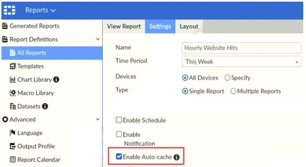 'Enable auto-cache in the report settings to boost the reporting performance and reduce report generation time. Scheduled reports have auto-cache enabled already.'