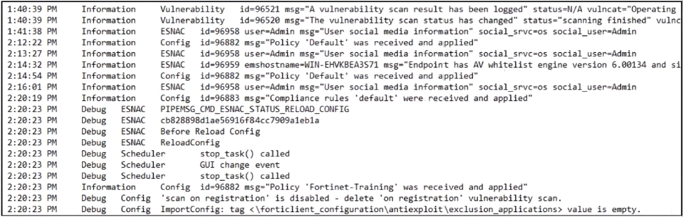 Based on the FortiClient logs shown in the exhibit which endpoint profile policy is currently applied to the FortiClient endpoint from the EMS server?