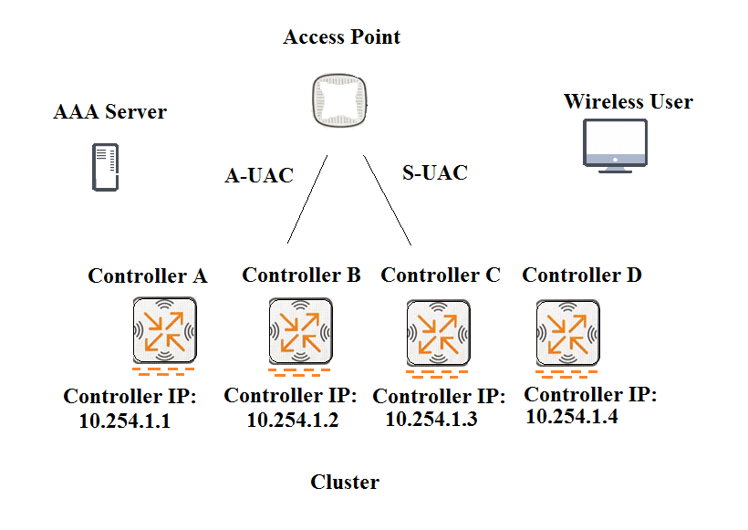 Refer to the exhibit. An administrator implements an L2 cluster of Aruba Mobility Controllers (MCs) as shown in the exhibit. An external RADUIS AAA server authenticates clients associated with the Active User Anchor Controller (A-UAC), where the NAS IP address sent from Controller B is 10.254.1.2.