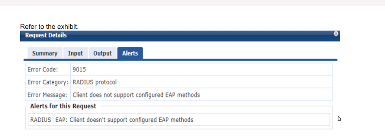 A company has an Aruba Instant AP cluster. A Windows 10 client is attempting to connect a WLAN that enforces WPA3-Enterprise with authentication to ClearPass Policy Manager (CPPM). CPPM is configured to require EAP-TLS. The client authentication fails. In the record for this client's authentication attempt on CPPM, you see this alert.