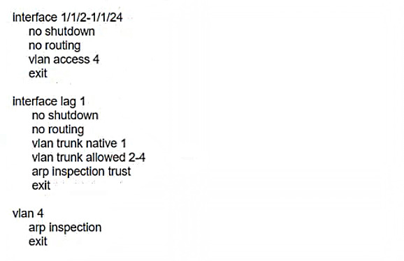 A customer requires protection against ARP poisoning in VLAN 4. Below are listed all settings for VLAN 4 and the VLAN 4 associated physical interfaces on the AOS-CX access layer switch: