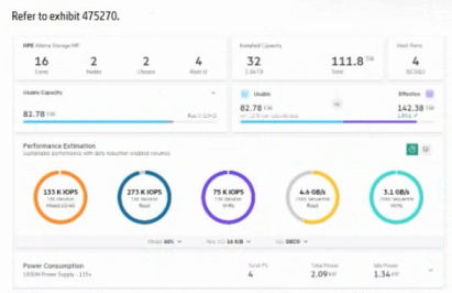 The exhibit shows an Alletra MP configuration delivering ~4.6 GB/s (256 KB sequential read) with four 10 Gb host ports. That throughput is close to the aggregate front-end bandwidth ceiling of 410 GbE (5 GB/s raw, less with protocol overhead). For large-block sequential workloads, the front-end link budget is often the bottleneck; adding additional 10 GbE ports (or moving to higher-speed links) increases available host bandwidth and raises sustained sequential read throughput. This aligns with HPE sizing guidance: scale host connectivity to meet sequential throughput targets before adding media.