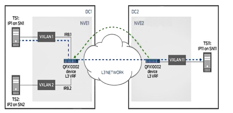 The connection between DC1 and DC2 is routed as shown in the exhibit.