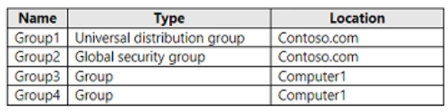 Your network contains an Active Directory domain named contoso.com. The domain contains a computer named Computer1 that runs Windows 10. You have the groups shown in the following table.