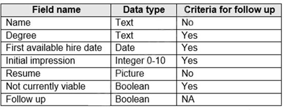 The human resources (HR) representatives of the company plan to attend school career fairs. The HR representatives must qualify and enter potential job candidates into a Power Apps app. The HR representatives must enter the following information for each candidate: