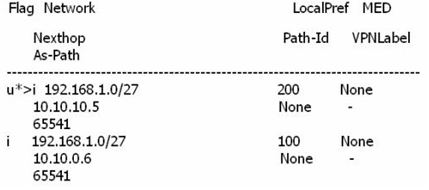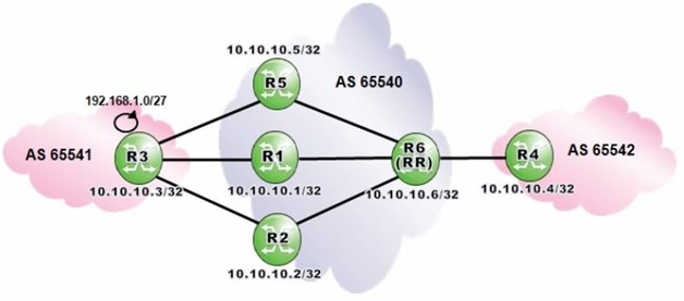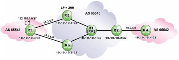 Router R1 is a route reflector with clients R2, R5 and R6. Prefixes advertised by router R5 have a local preference of 200. Router R3 advertises the prefix 192.168.1.0/27 to routers R5 and R6. Assuming that none of the routers in AS 65540 is configured with "advertise-external", what is the expected output of "show router bgp routes on router R1?