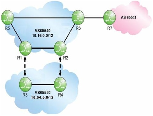 AS 65550 owns CIDR block 10.64.0.0/12. Router R6 advertises the aggregate 10.64.0.0/12 to AS 65541 with "as-set" enabled. Which of the following is TRUE regarding the aggregate route received by router R7?