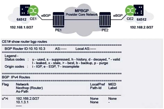 The CLI command ''remove-private'' is configured on PE1 to eliminate BGP loops in the VPRN.