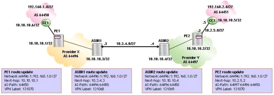 For the Inter-AS model B VPRN, which of the route updates for prefix 192.168.1.0/27 is incorrect?