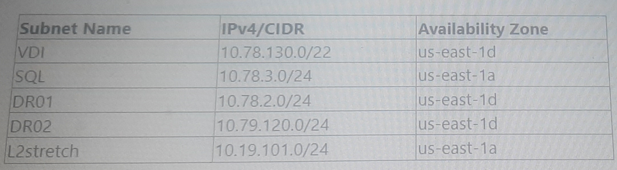 Administrator has recently deployed an NC2 cluster on AWS in the North Virginia region in availability zone us-east-id. The consuming IPS from a 10.78.2.0/24 range.