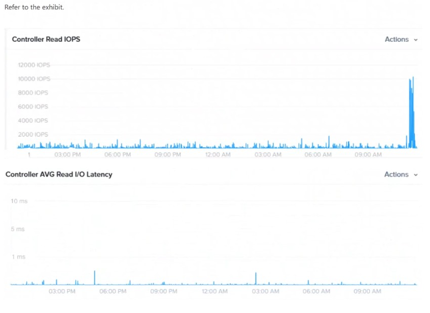 An administrator is monitoring cluster I/O and Latency during VDI user logins shortly after 9:00am.