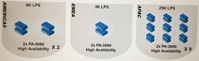 A network covers three geographical areas: Americas, Europe (EMEA), and Asia (APAC). The APAC segment of the network consists of nine HA pairs of PA-3060 firewalls, generating a combined log output of 25 K logs per second. Only 14 days of traffic log retention is required.