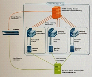 Given the following network diagram, an administrator is considering the use of Windows Log Forwarding and Global Catalog servers for User-ID implementation. What are two potential bandwidth and processing bottlenecks to consider? (Choose two.)