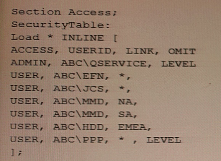 The Section Access security table for an app is shown. User ABC\PPP opens a Qlik Sense app with a table using the field called LEVEL on one of the table columns.
