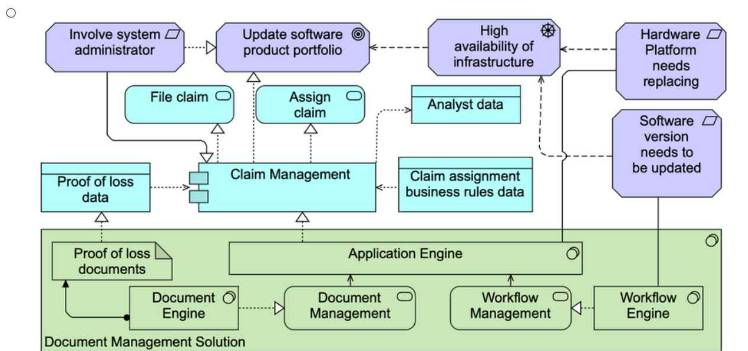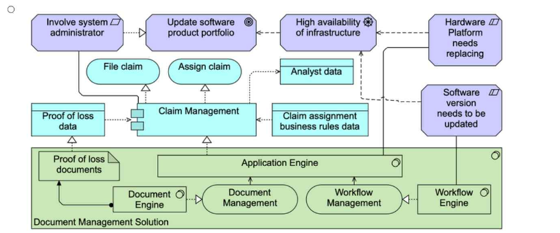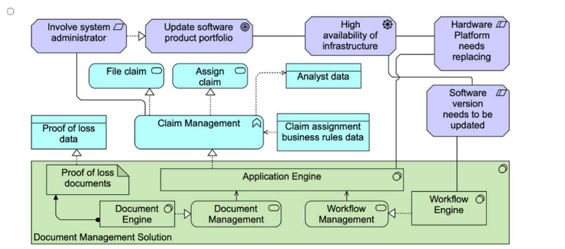 This scenario revolves around ArchiSurance's document management solution and the motivations behind updating the solution due to software and hardware challenges. The task is to model both the applications and technology components involved, along with the motivations driving the need for an update.
