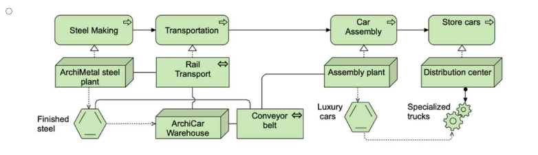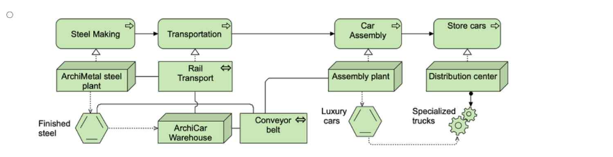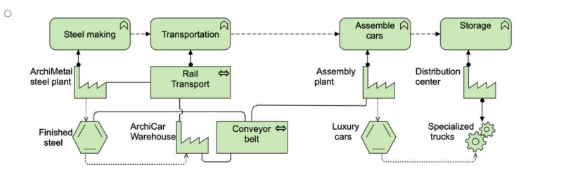 In this scenario, the task is to model the end-to-end technology processes at ArchiCar, showing how raw materials (finished steel) are processed through the company's manufacturing, transportation, and distribution system, ultimately resulting in fully assembled cars ready for delivery.