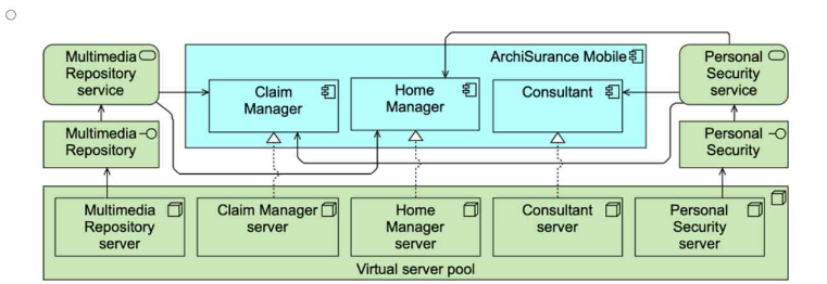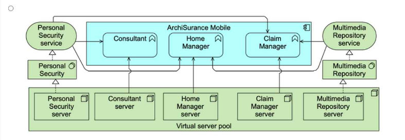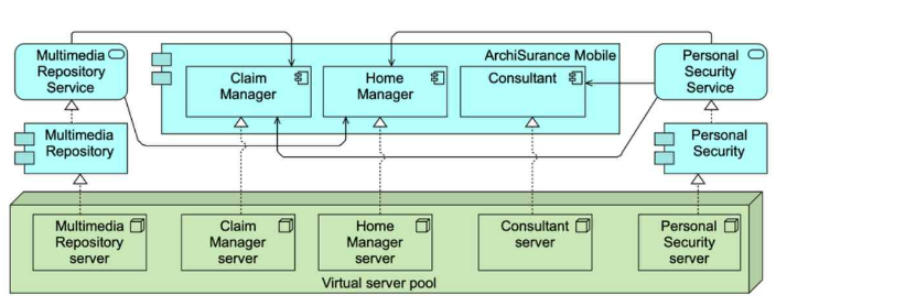 Each application service is realized by an application component with the same name. Each technology service is realized by a system software environment, having the same name. ArchiSurance hosts both the application components and