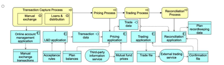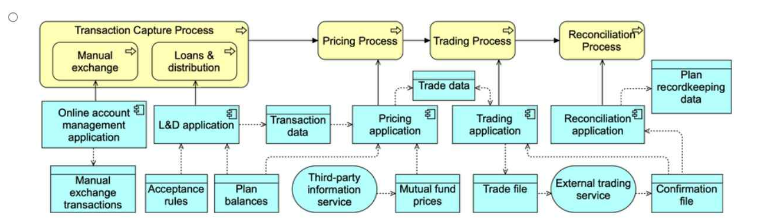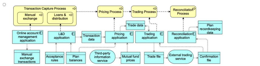Option B provides the most complete and accurate representation of the scenario. It captures the business processes (Transaction Capture, Pricing, Trading, Reconciliation) and their sub-processes, while showing the appropriate connections to the applications that support these processes.