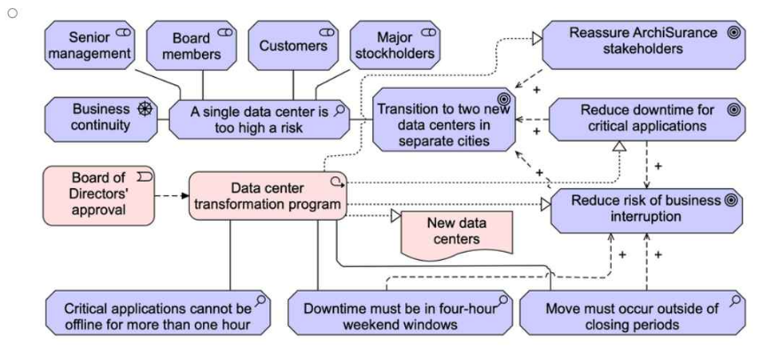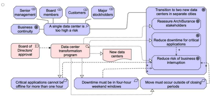 The migration must avoid closing periods. Links deliverables to objectives -- The data center transformation program and new data centers are clearly positioned as solutions. Represents dependencies correctly -- Showing how each motivation leads to a goal, which leads to a deliverable.