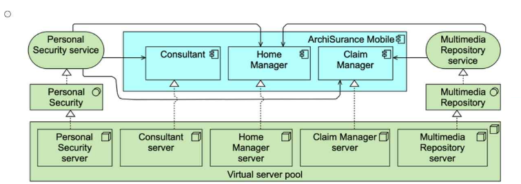 Option C provides the most accurate and complete description of the ArchiSurance Mobile solution and the supporting technology, as required by the scenario. It correctly illustrates the relationships between the applications, the virtual servers, and the supporting technology services according to ArchiMate 3.2 principles.