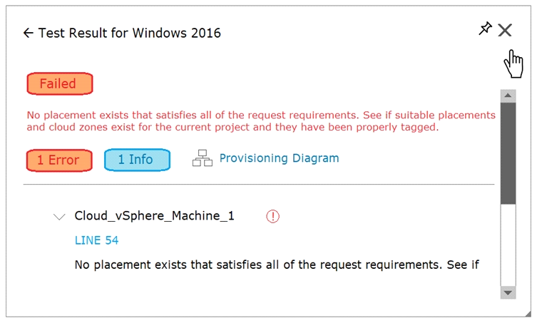 An administrator is testing a newly created Windows 2016 blueprint in Cloud Assembly. While using the Test option from within the blueprint, the attached error appears.